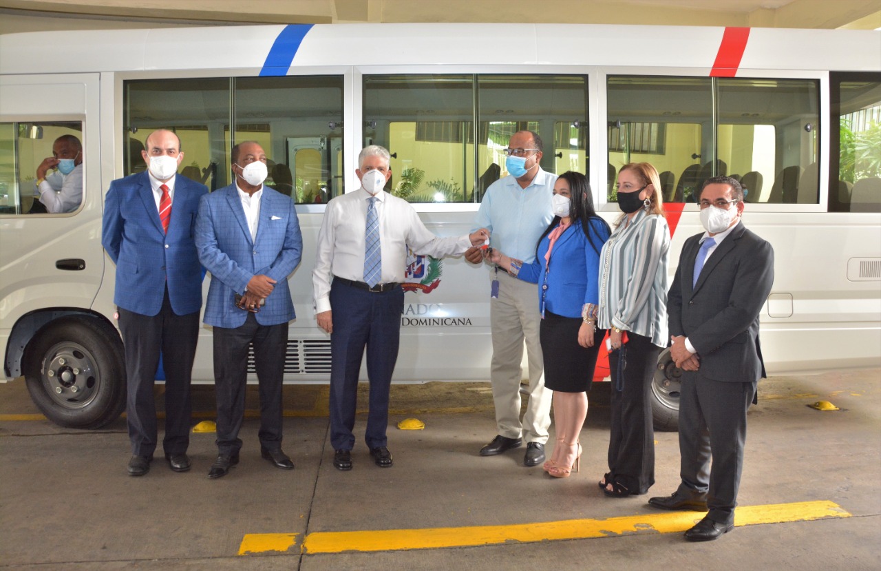 Santo Domingo. 15-02-2021.- El presidente del Senado de la República, Eduardo Estrella (Santiago), hizo entrega formal este lunes de dos autobuses marca Toyota del 2020, con capacidad para 30 pasajeros, a la Dirección de Recursos Humanos de la institución, además, un minibús de 16 pasajeros marca Hiace del 2020, con el fin de dar servicio de transporte a los colaboradores de la Cámara Alta.