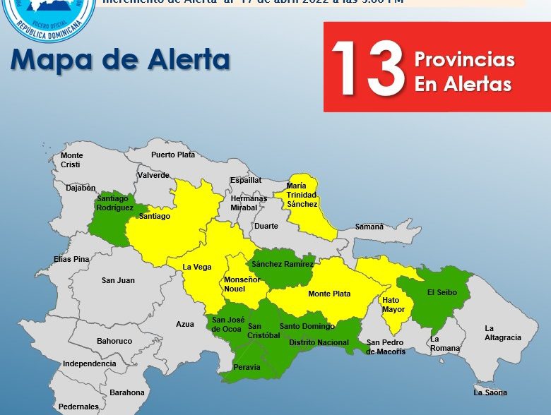 El Centro de Operaciones y Emergencias (COE), informó este domingo que elevó a trece las provincias en alerta, de las cuales siete están en verde y seis en amarilla, ante la incidencia de una vaguada que podría estar generando algunas lluvias en el país.