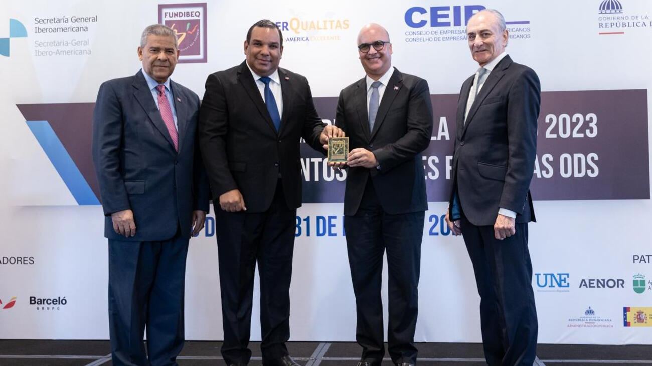 En una ceremonia celebrada en el Hotel El Embajador, el director ejecutivo de la CNE, Edward Veras, recibió la placa de reconocimiento de manos de Juan Luis Martín Cuesta, director general de Fundibeq; Darío Castillo, titular del MAP, e Igor Rodríguez, ministro Administrativo de la Presidencia.