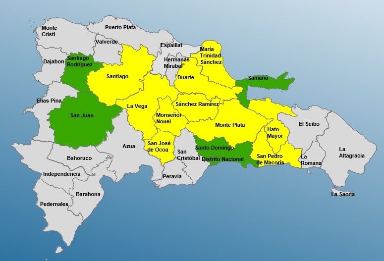 En alerta amarilla fueron colocadas las provincias de Hato Mayor, La Vega, Monseñor Nouel, Santiago, Sánchez Ramírez, Monte Plata, San José de Ocoa, San Pedro de Macorís, María Trinidad Sánchez y Duarte, en especial en la región del bajo Yuna.
