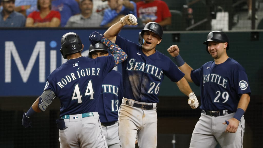 El novato Rodríguez bateó el primer cuadrangular con la casa llena en cuenta completa por encima del muro del central, para su 16to jonrón del año, y finalizó con cinco empujadas, el mayor total de su carrera. Su sencillo impulsor en el cuarto episodio puso a los Marineros arriba 3-0.