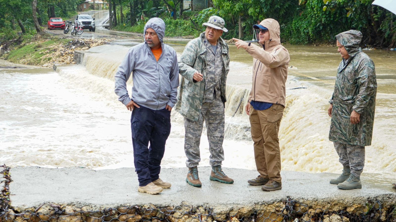 Luego visitaron el puente sobre el río El Higüero, en la comunidad de Los Pérez del municipio Villa Montellano, donde brigadas con equipos pesados retiraban los escombros para normalizar el tránsito que se había detenido por el desbordamiento.