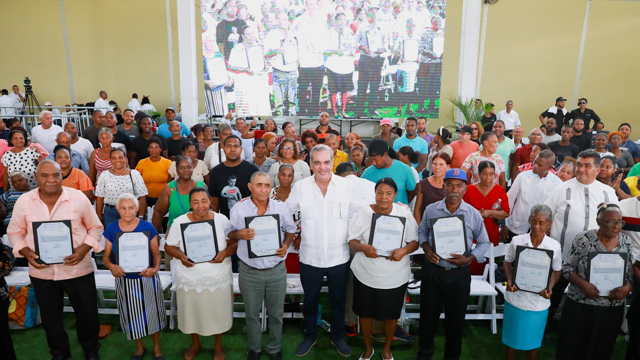 Azua.- El presidente Luis Abinader concluyó su agenda de trabajo de este sábado con la entrega de 450 títulos de propiedad para beneficiar a 2,404 personas en el distrito municipal Las Clavellinas, en provincia de Azua.