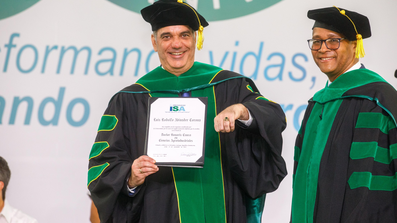 Santiago.- El presidente Luis Abinader recibió este sábado el título “doctor honoris causa” en Ciencias Agroindustriales, la más alta distinción, otorgada por la Universidad ISA, en reconocimiento de su liderazgo visionario y las iniciativas impulsadas para fortalecer los programas educativos y el sector agroindustrial y productivo del país.
