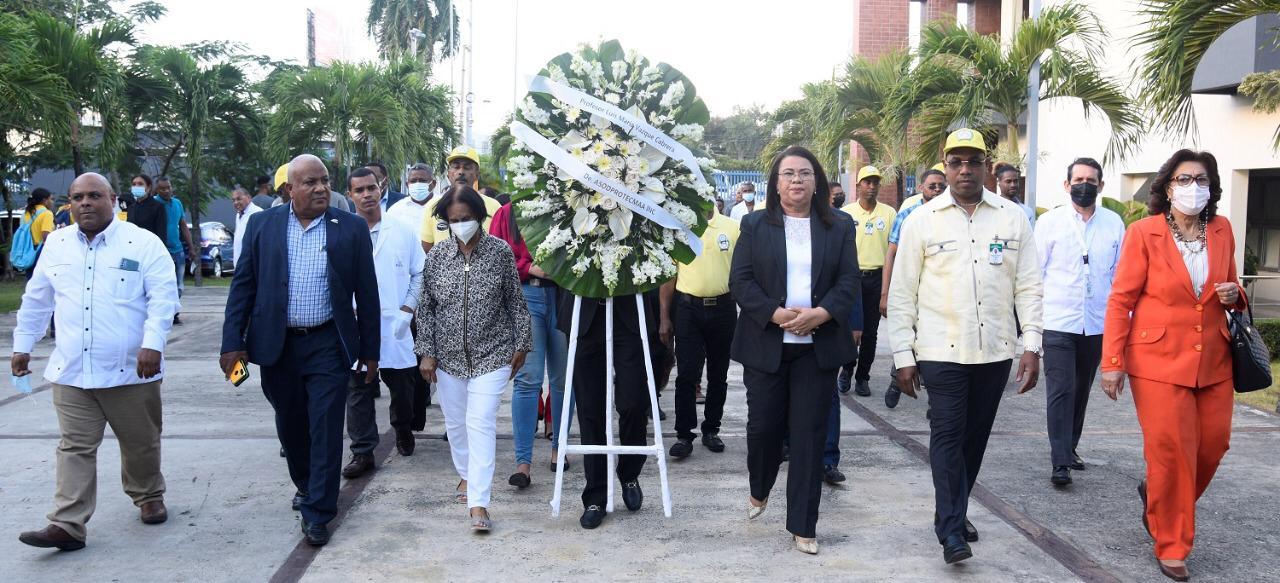 La señora Altagracia Estela Soto, viuda Vásquez, recibió una placa en reconocimiento póstumo de su esposo y participó junto a los demás en la ofrenda floral que se realizó en los talleres de mecánica automotriz.