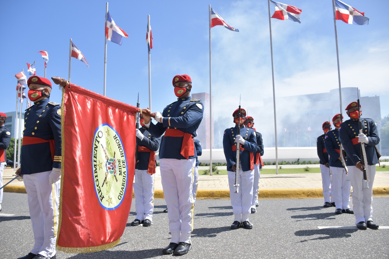 Durante la ceremonia, el presidente del Senado de la República, Eduardo Estrella, y Alfredo Pacheco, presidente de la Cámara de Diputados, entregaron la Bandera Nacional a la educadora Ángela Caba, viuda de Ricart.