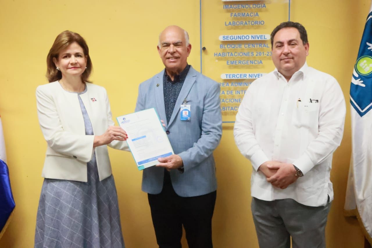 La vicepresidenta de la República, Raquel Peña, recibió este miércoles, junto al director del Servicio Nacional de Salud, doctor Mario Lama, el certificado de garantía de los trabajos realizados en los techos del Hospital Traumatológico Doctor Darío Contreras, con una inversión total de RD$ 47,325,041.18.